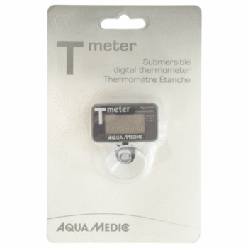 Digital underwater thermometer for attachment to the inner pane of the aquarium, including suction cup and battery.