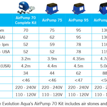 Airtech 70 Litre Air Pump (complete kit) – max output 70 litre per minute, includes pump, a 4 way manifold, 10 metres of airline and two airstones and it’s fitted with integrated thermal protection.