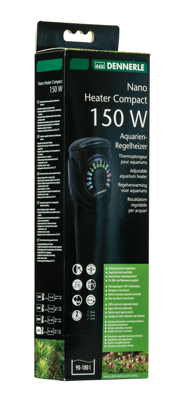 Nano Thermo Compact heaters convince especially because of their flat design and the visually appealing black color. They are available in 4 different watt strengths. A shatterproof plastic housing and the integrated electronic protection against a defect during dry running as well as overheating of the aquarium make a long life possible.